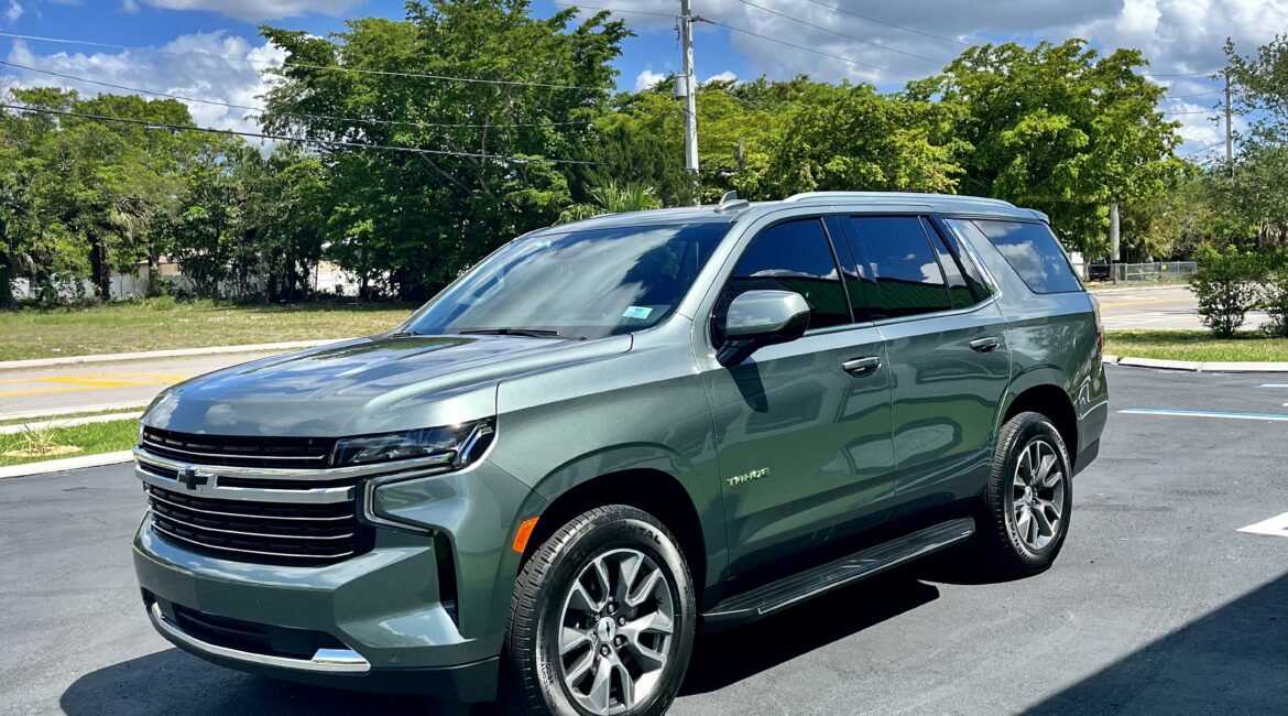 2023 Chevy Tahoe In Silver Sage Metallic. Black interior with Captain chairs Tinted windows and windshield