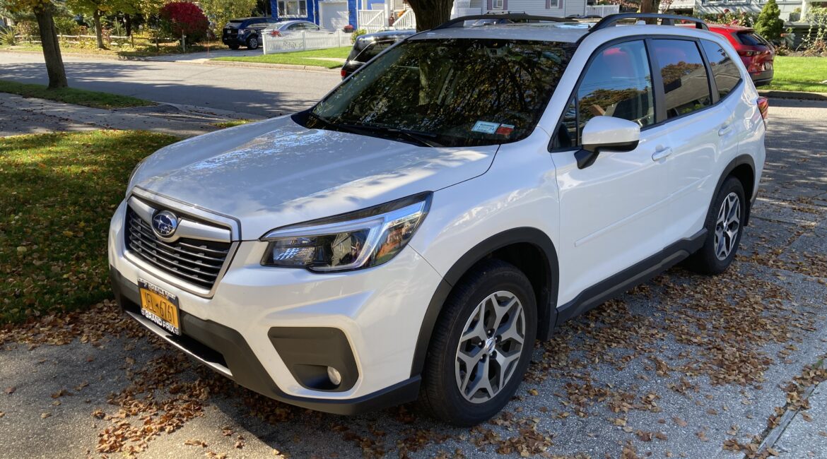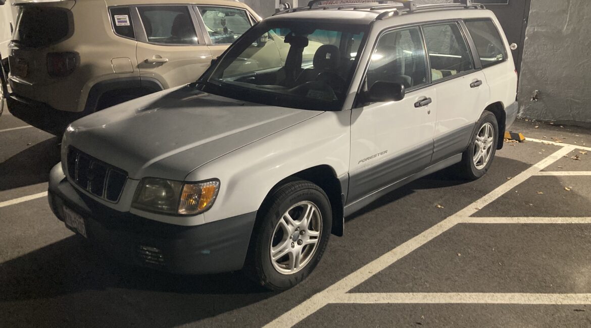 Completely stock and original Subaru Forester. White exterior and a black/grey interior. No modifications, has sunroof.
