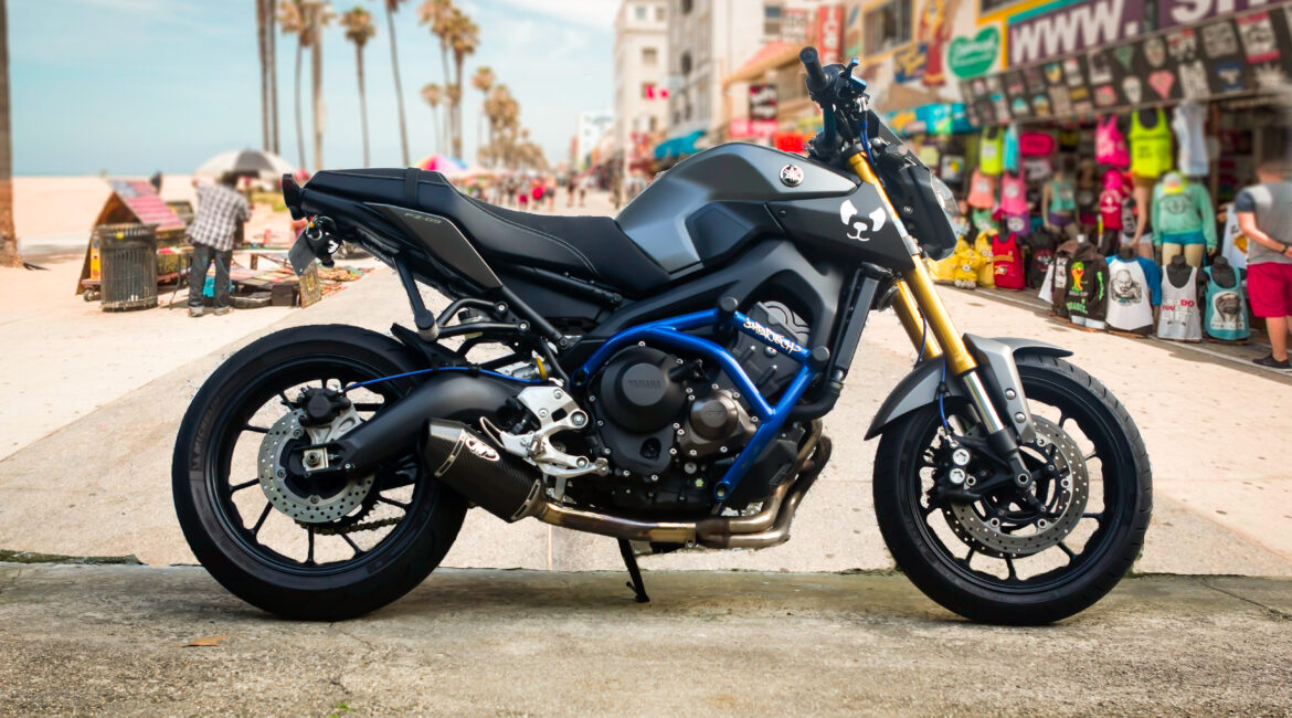 Full stunt cage in blue with exhaust and handlebar modifications. Motorcycle is matte black/grey in color.
