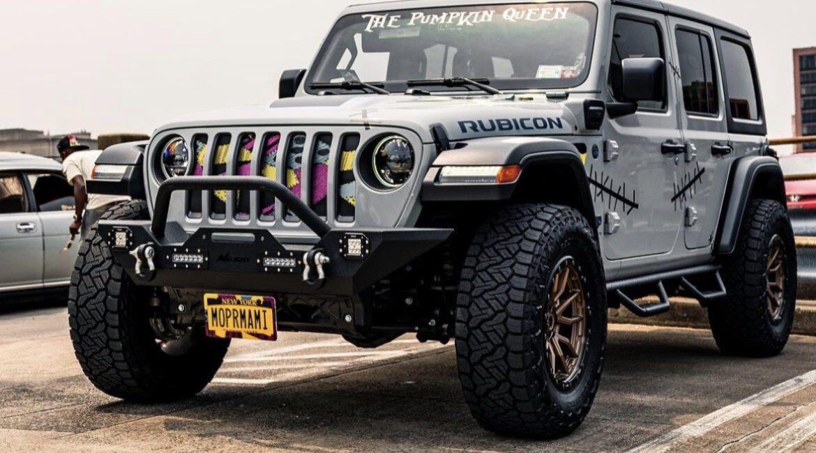 The nightmare before Christmas themed jeep wrangler hybrid 35” nitto recon grappler tires Bronze /black fuel wheels Nilight front Earl Grey