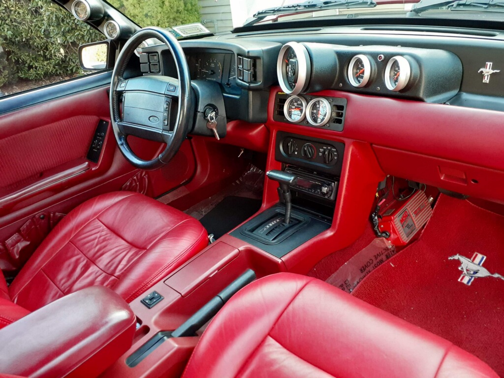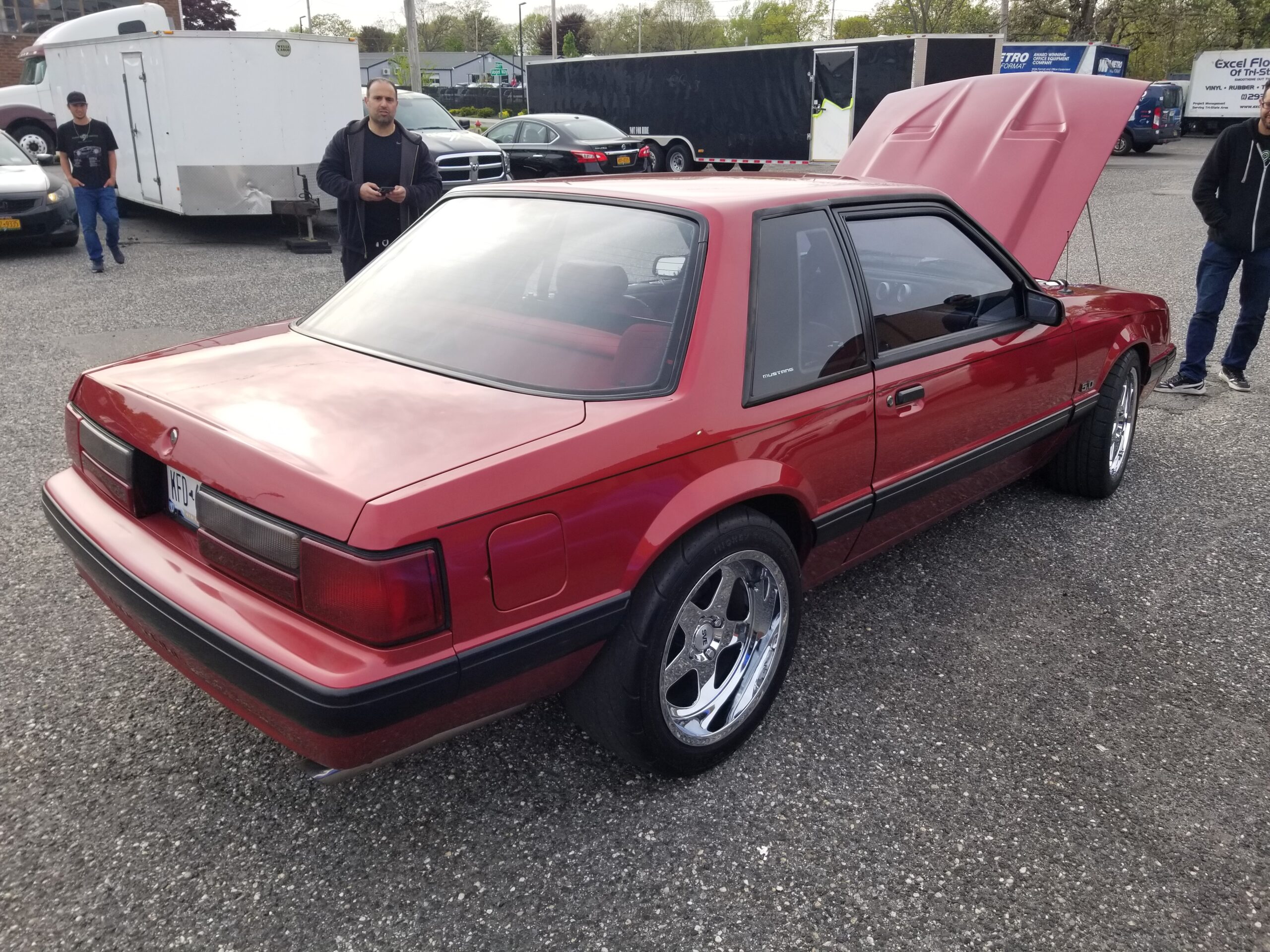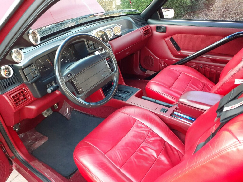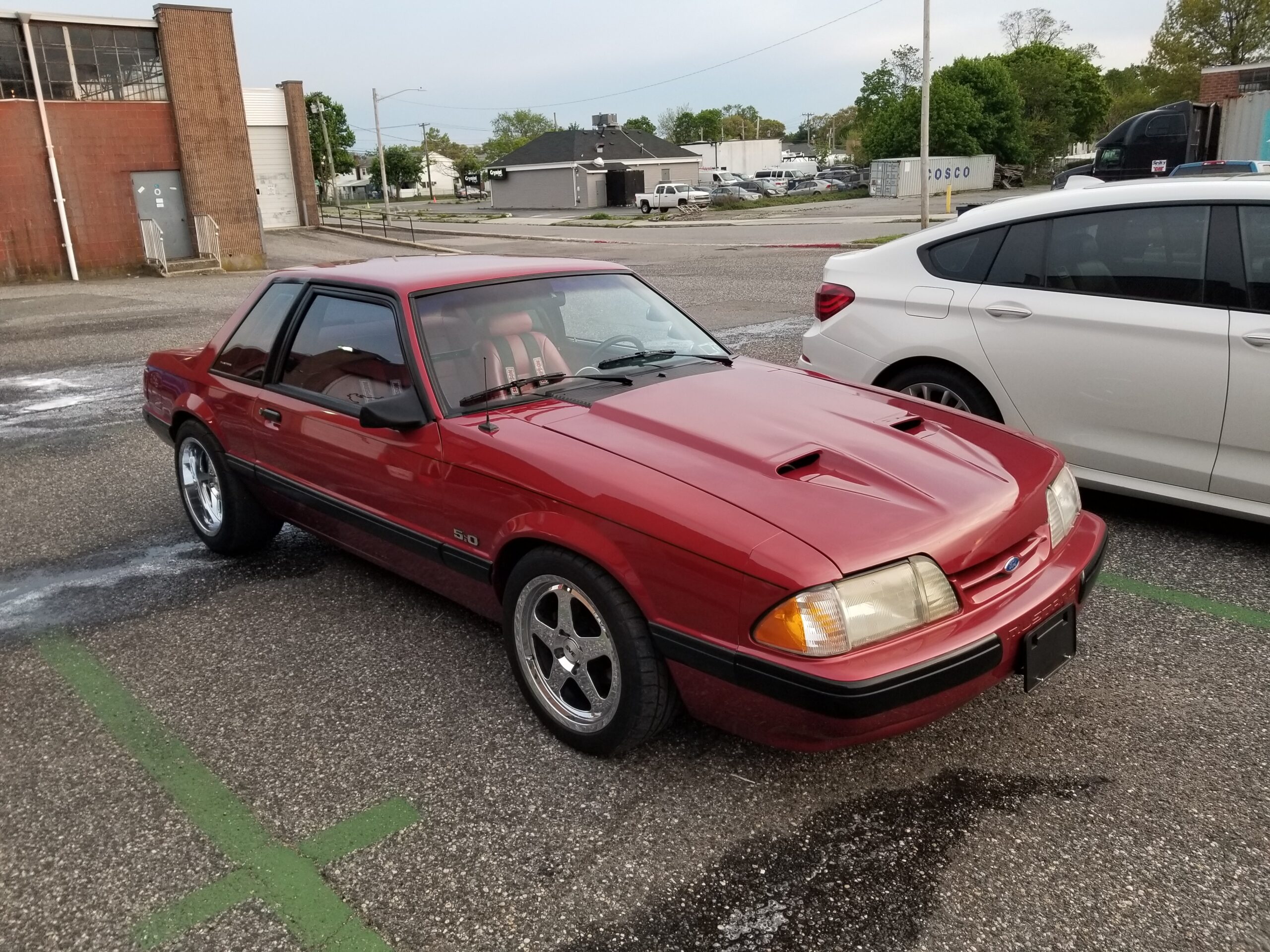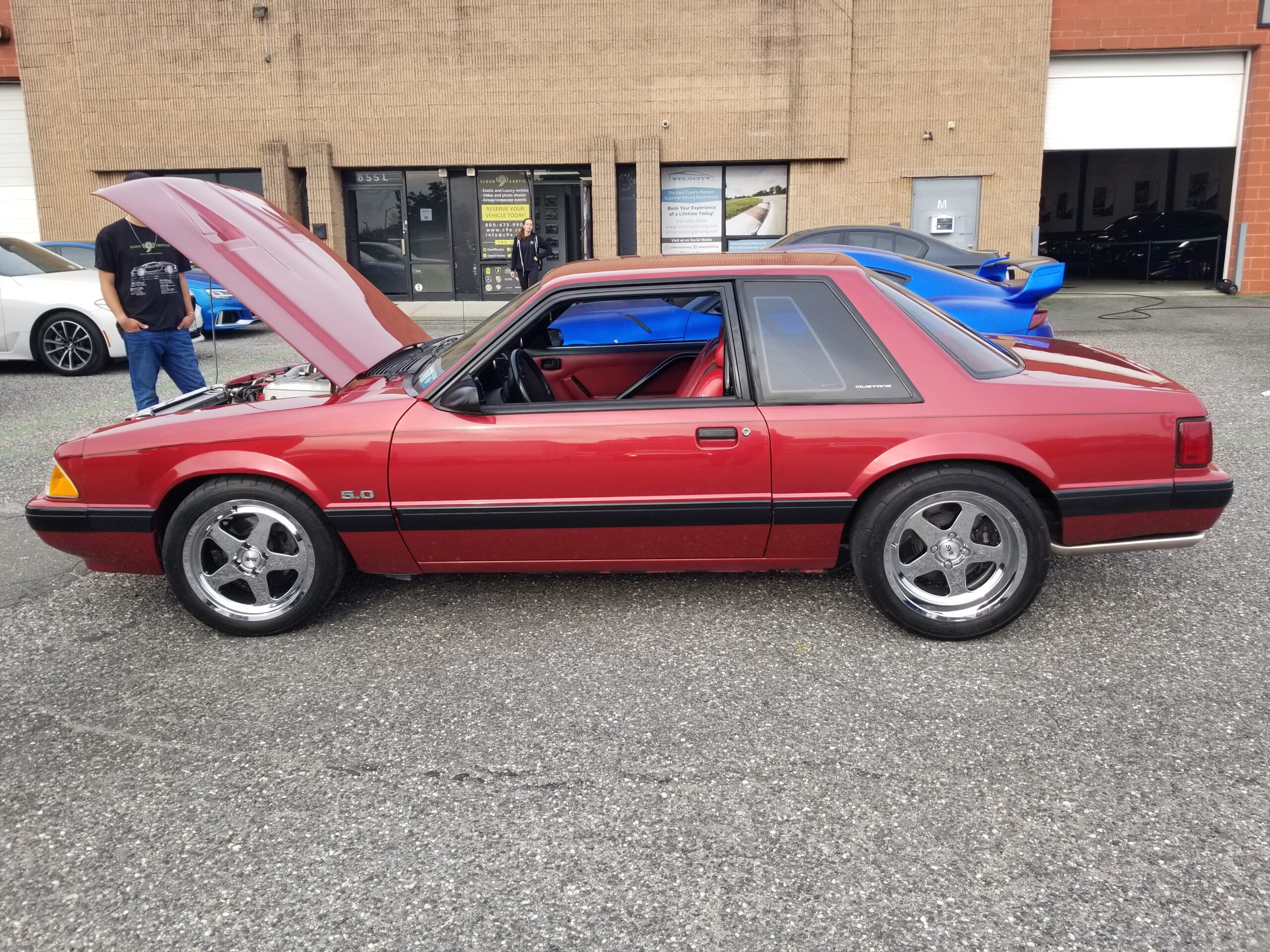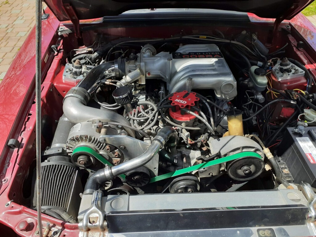 Motor built, procharged notchback Mustang with a roll cage, racing harness, racing wheels and tires, factory red paint, and custom exhaust.