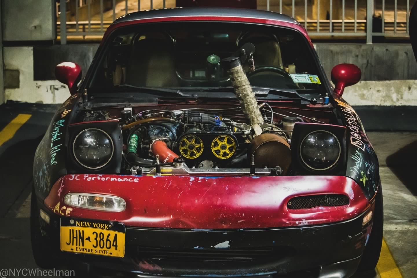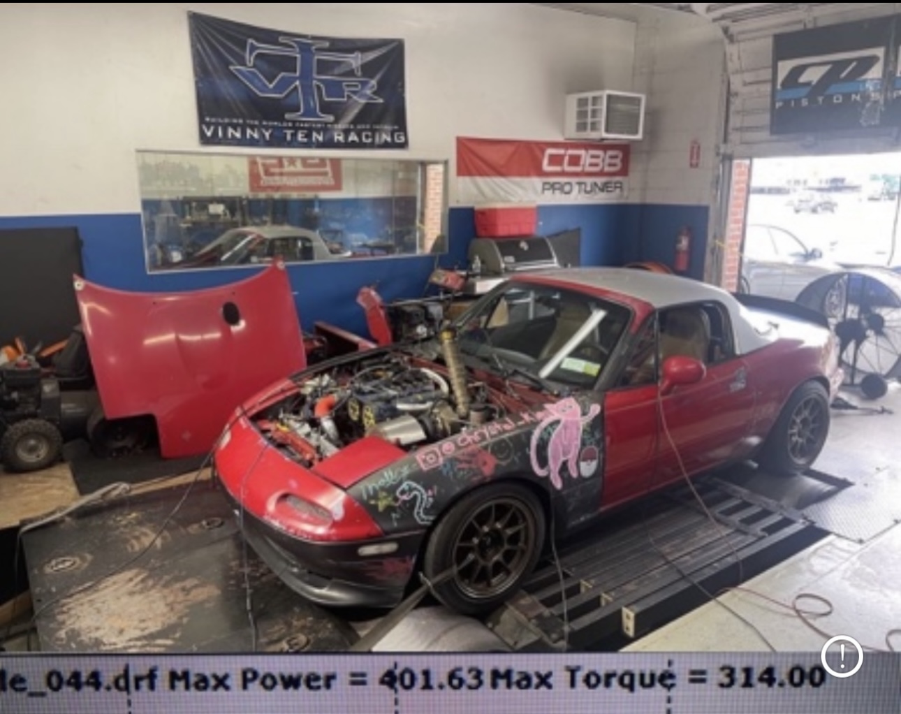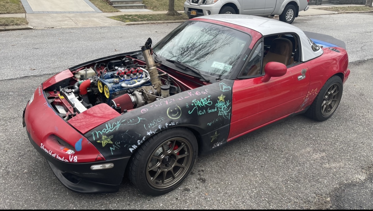Turbo 1.9L Miata – 400whp Resleeved and bored block Forged JE Pistons Forged Manley Rods Garrett gtx2867 MSM 6 Speed MSM intake manifold MSPNP2 ECU 1000cc Southbay injectors VTR Tune Konig wheels