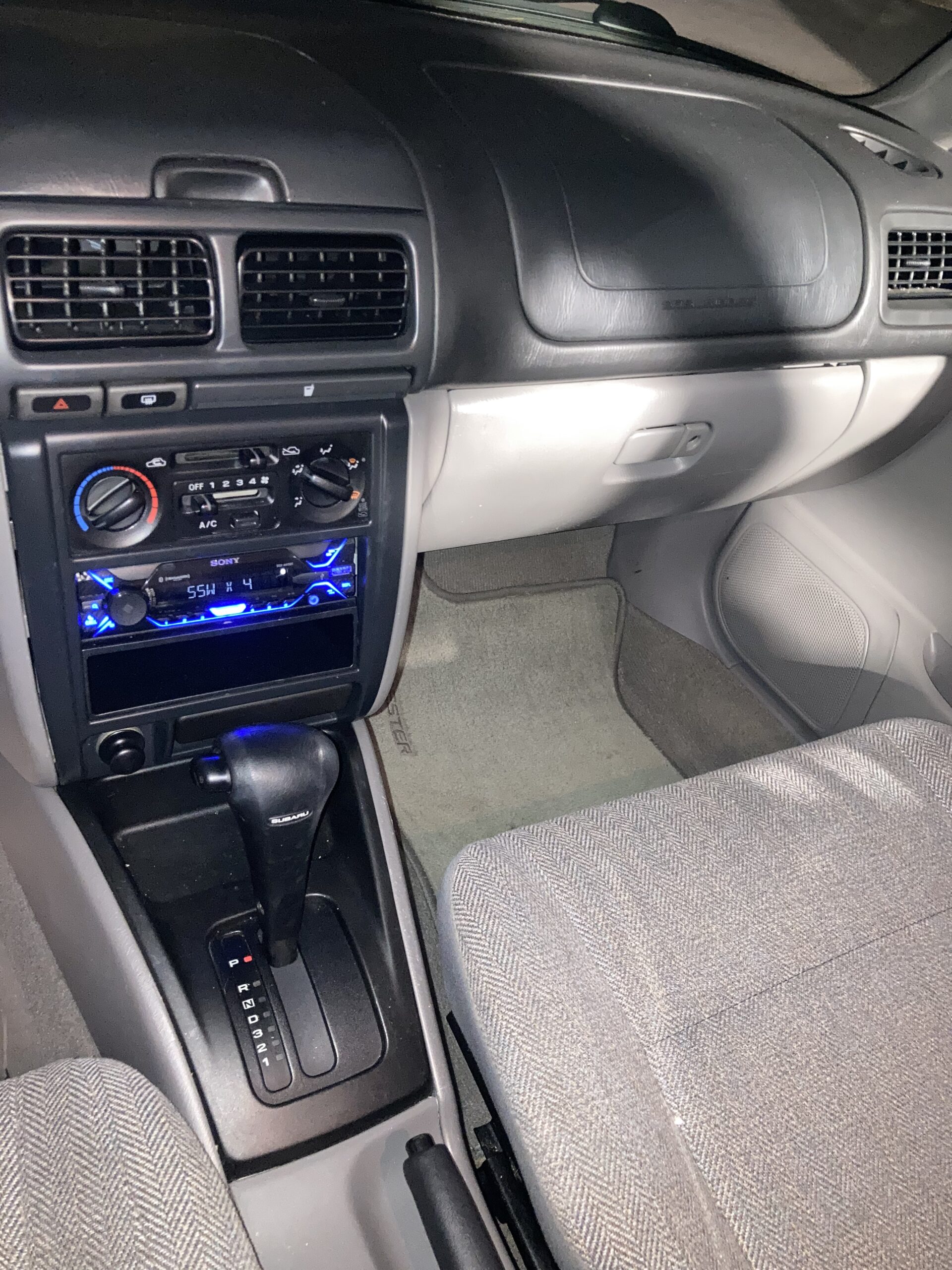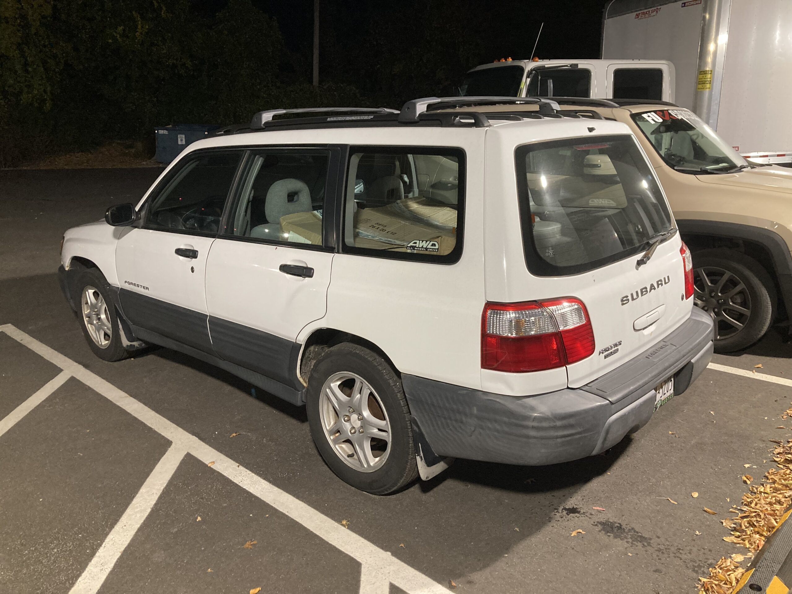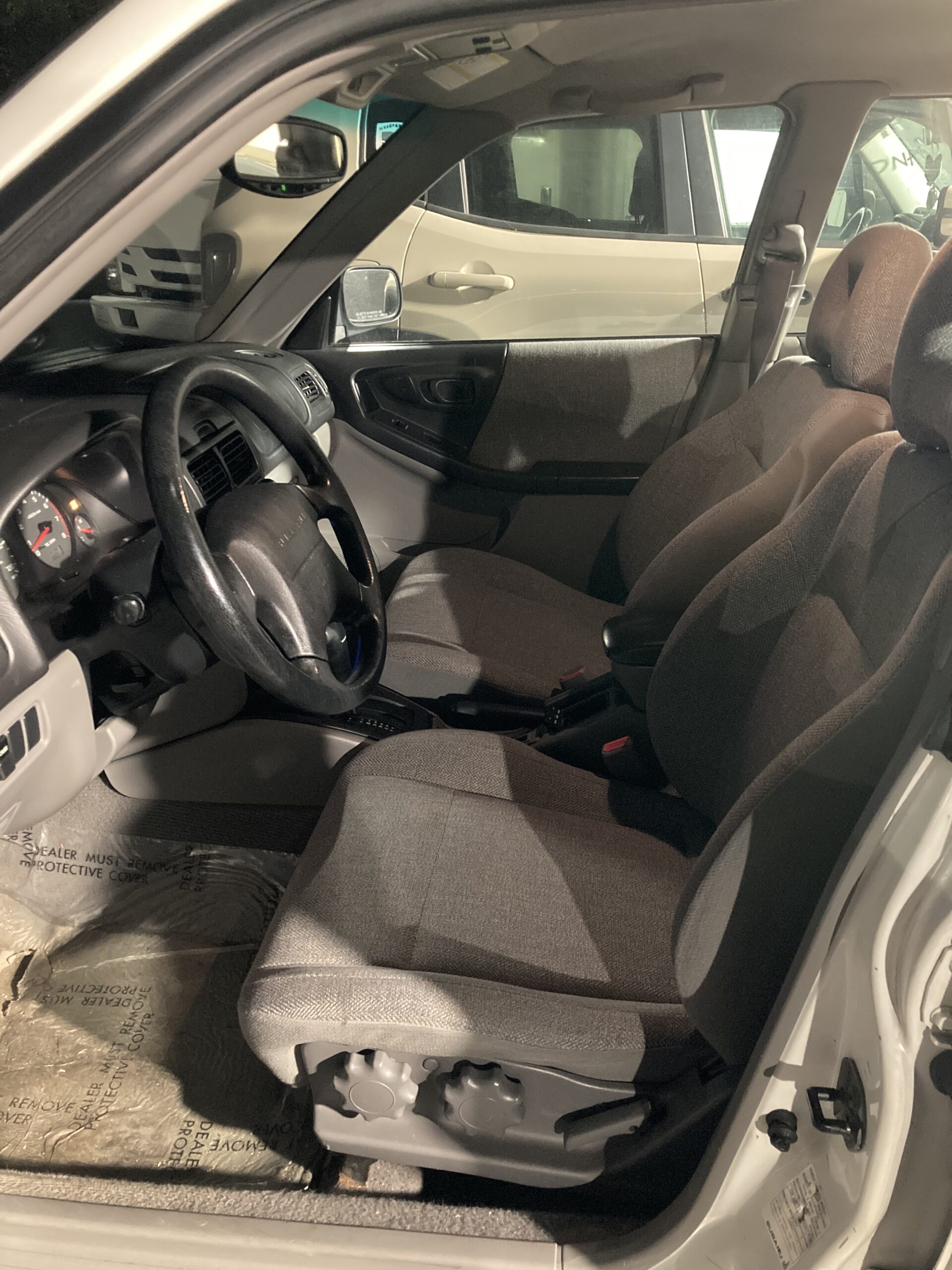 Completely stock Subaru Forester, white exterior with a grey interior. After market radio but factory interior.
