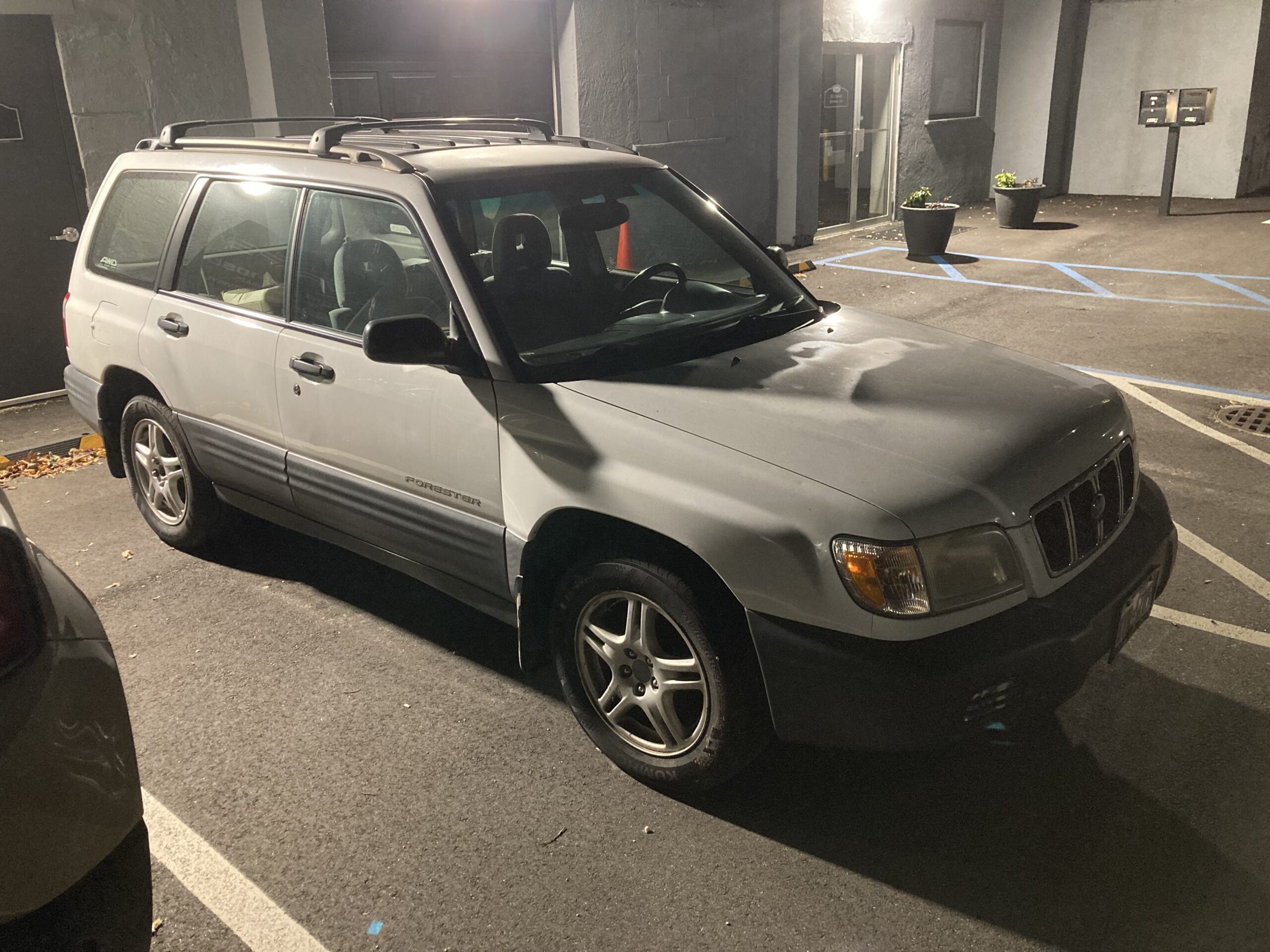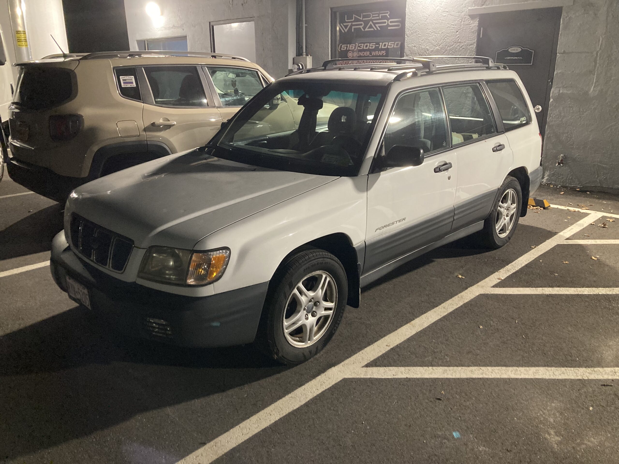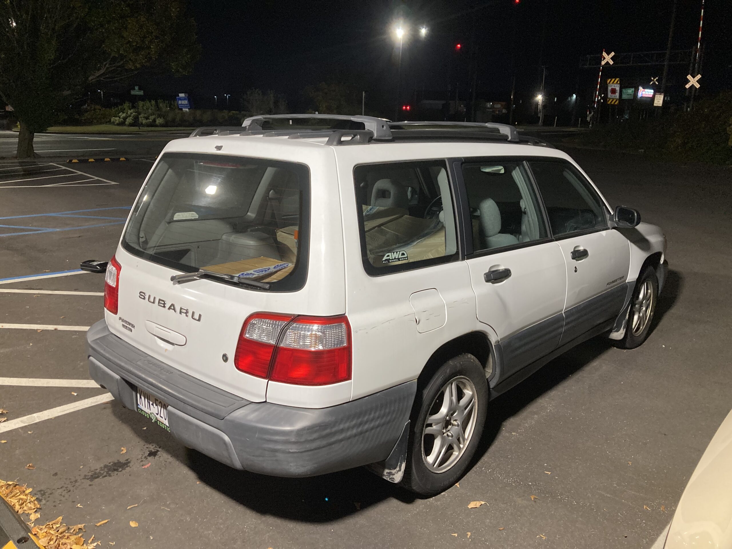 Completely stock Subaru Forester, white exterior with a grey interior. After market radio but factory interior.