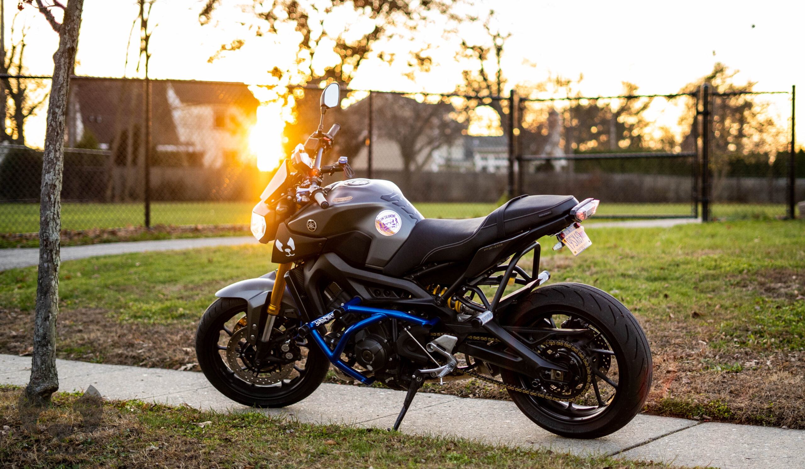 Full stunt cage in blue with exhaust and handlebar modifications. Motorcycle is matte black/grey in color.