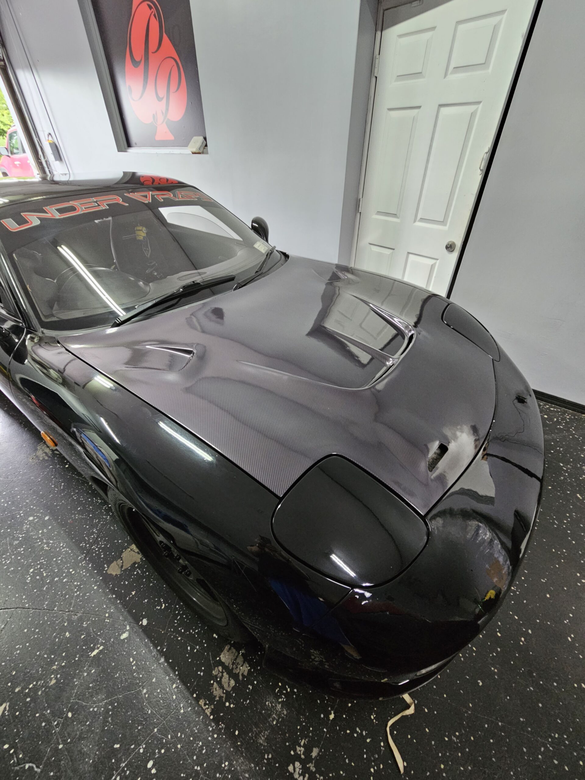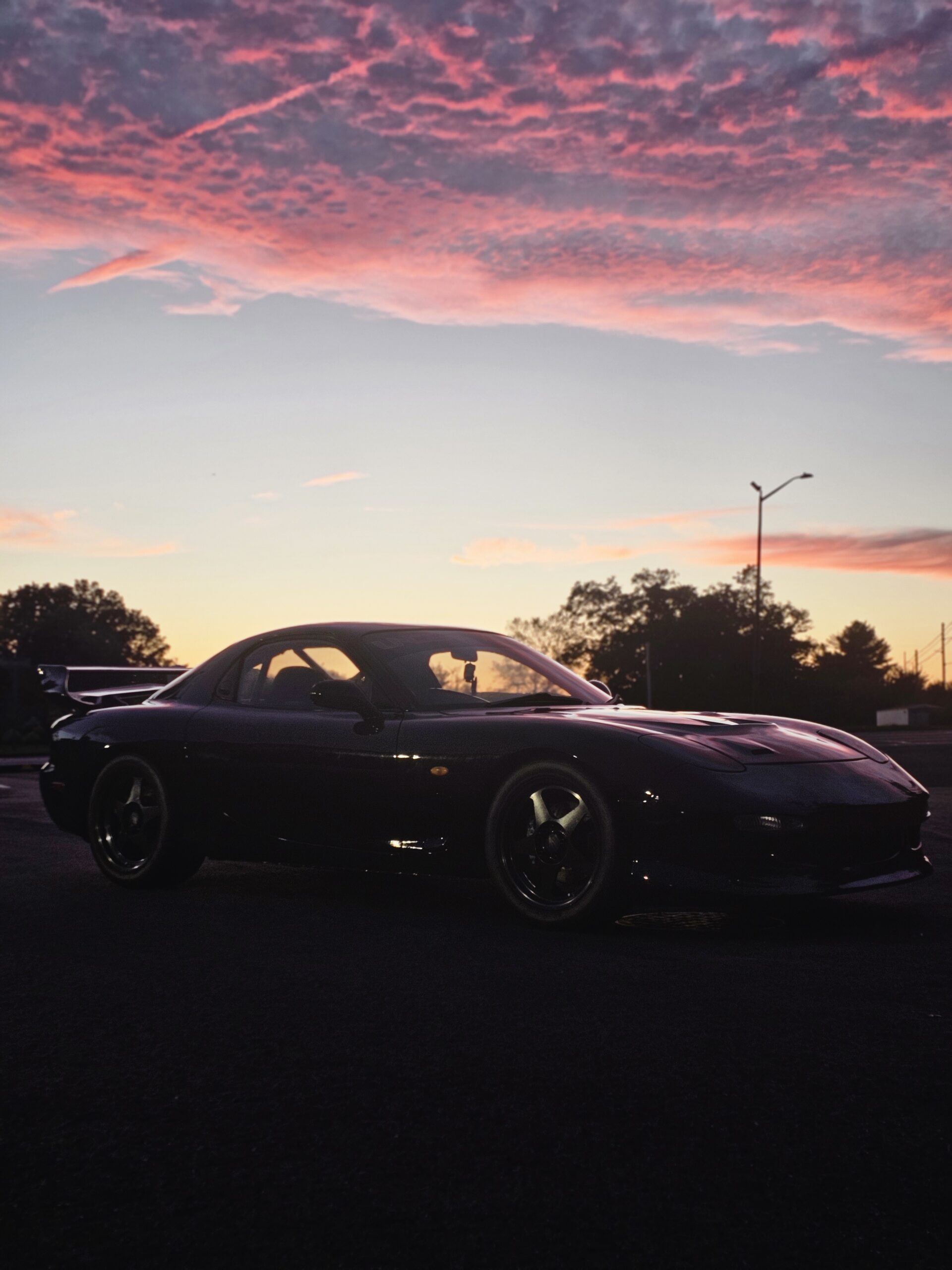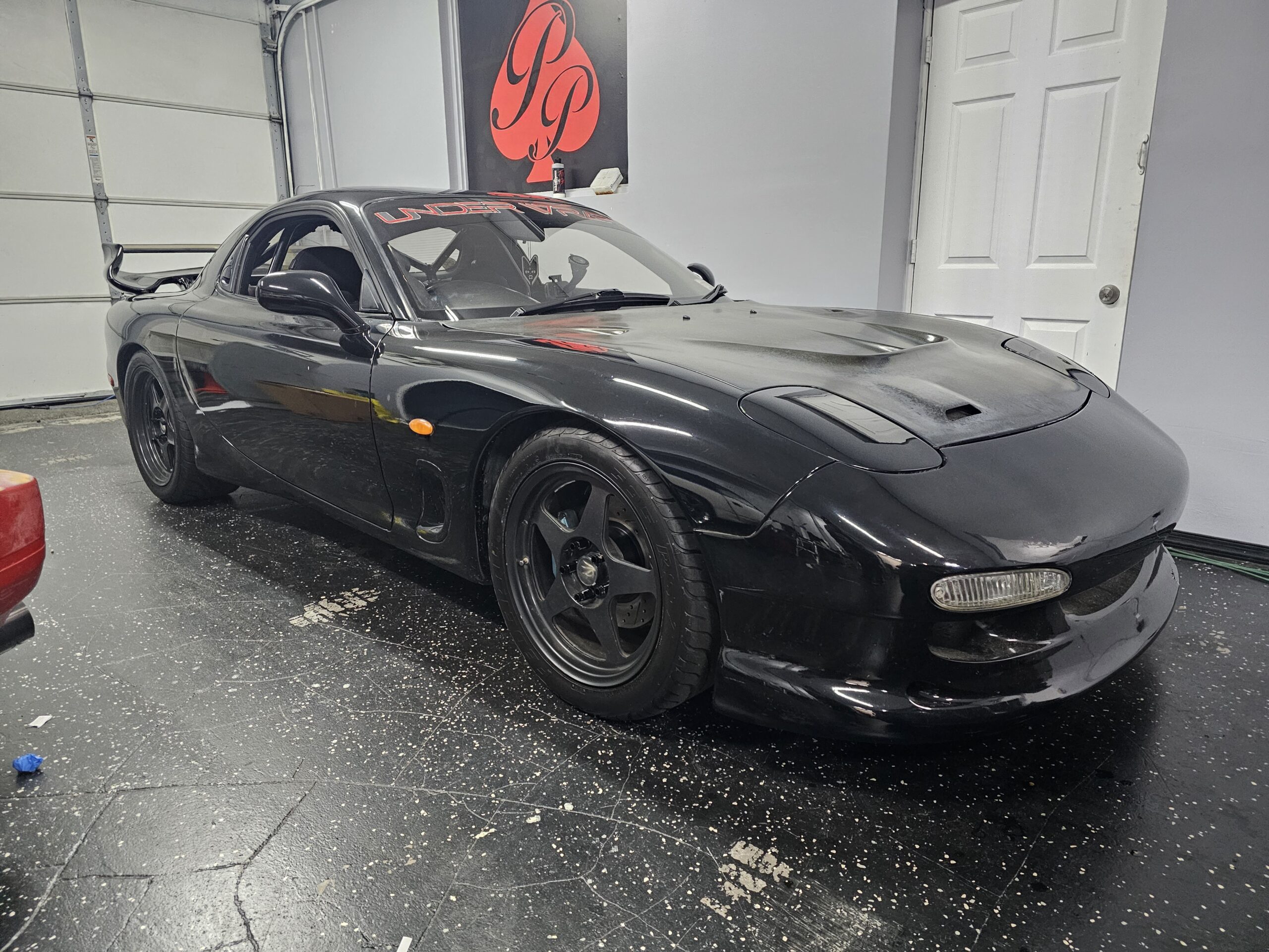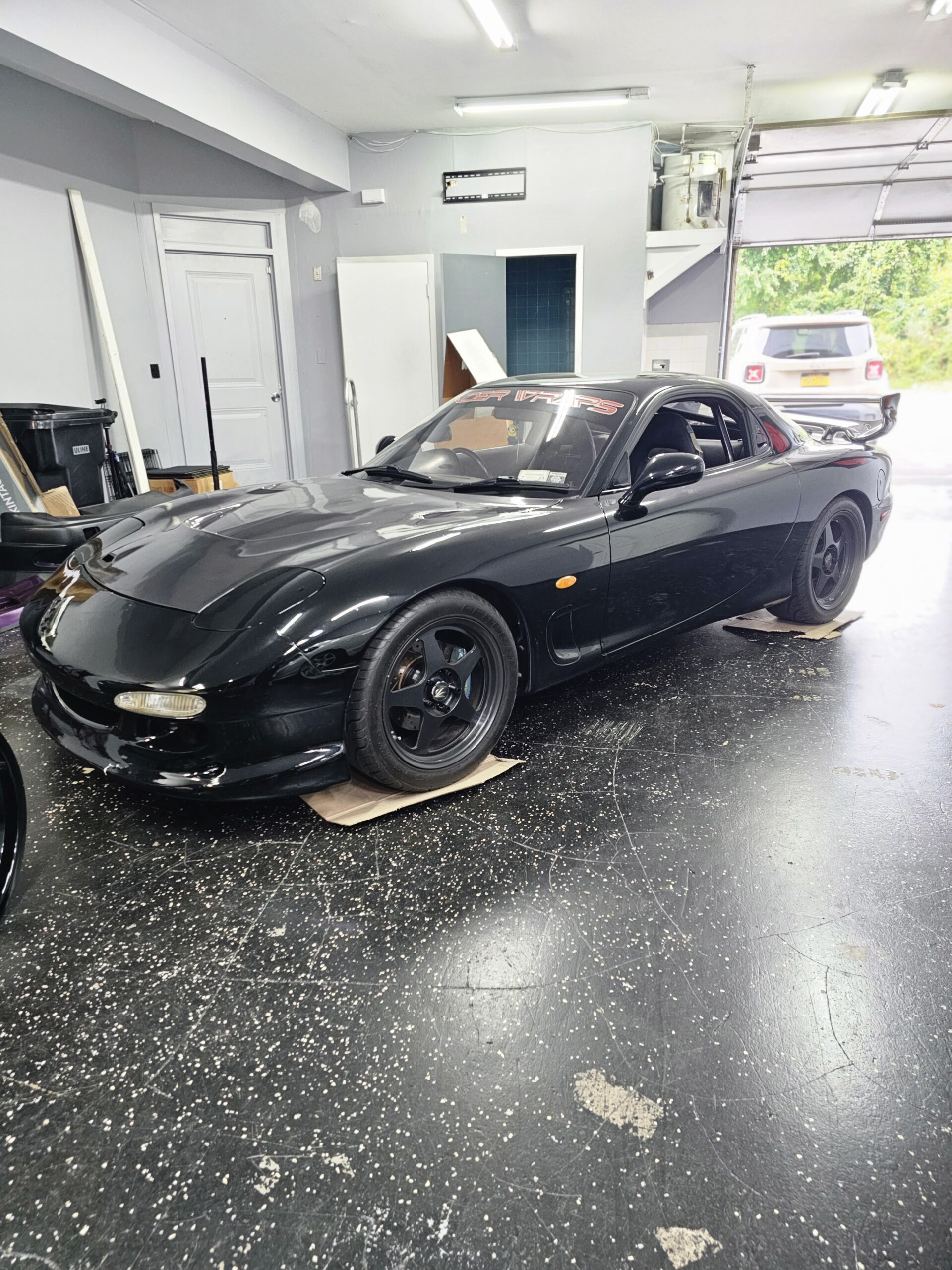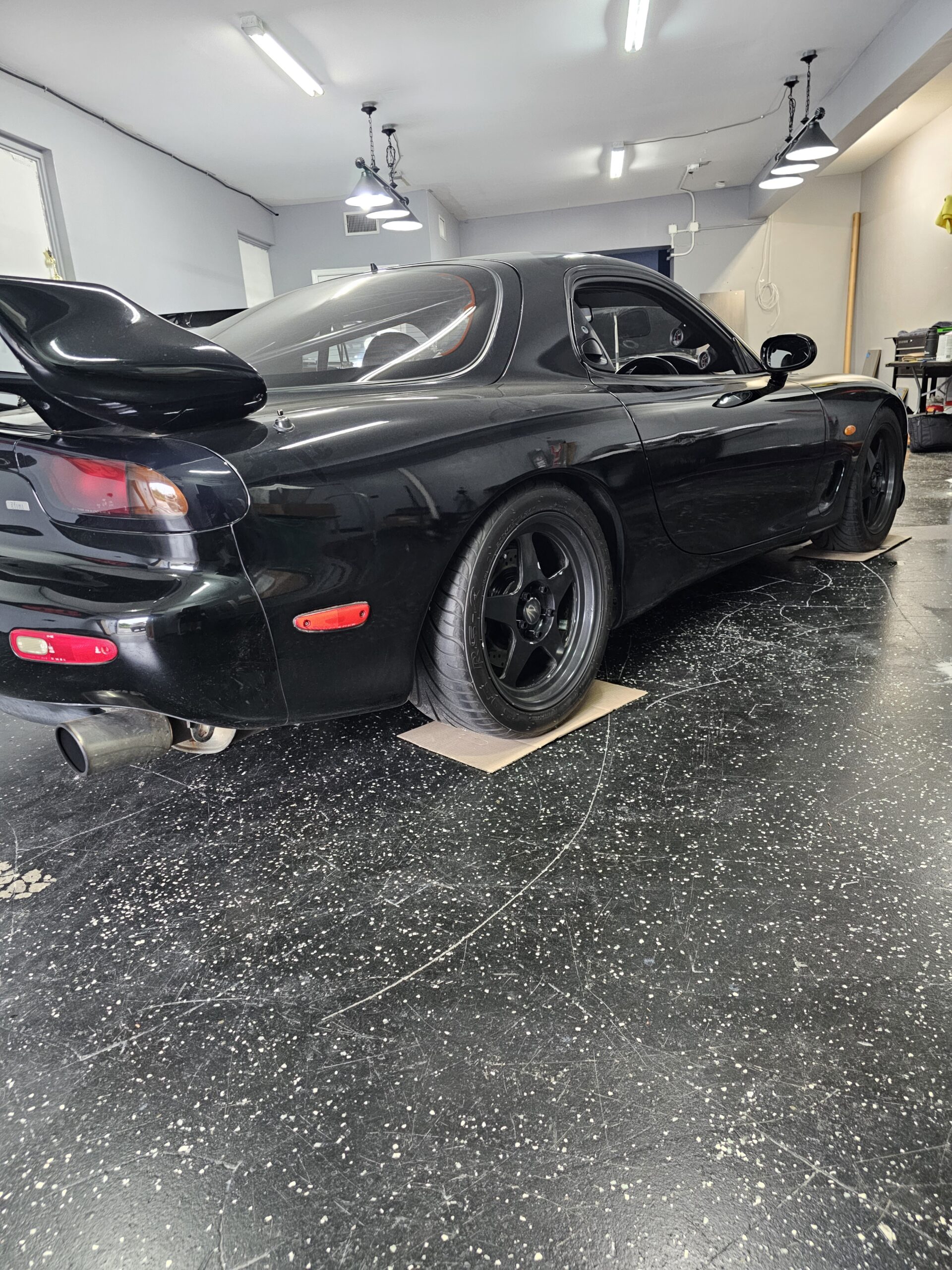 3rd generation FD3s Mazda rx7. The motor is a single turbo modified rotary with exhuast. The car has a carbon fiber hood and spoiler with a aftermarket front bumper and wheels. The car is black on black on black. The interior has a bolt in cage, gauges up the drivers a pillar and is right hand drive.
